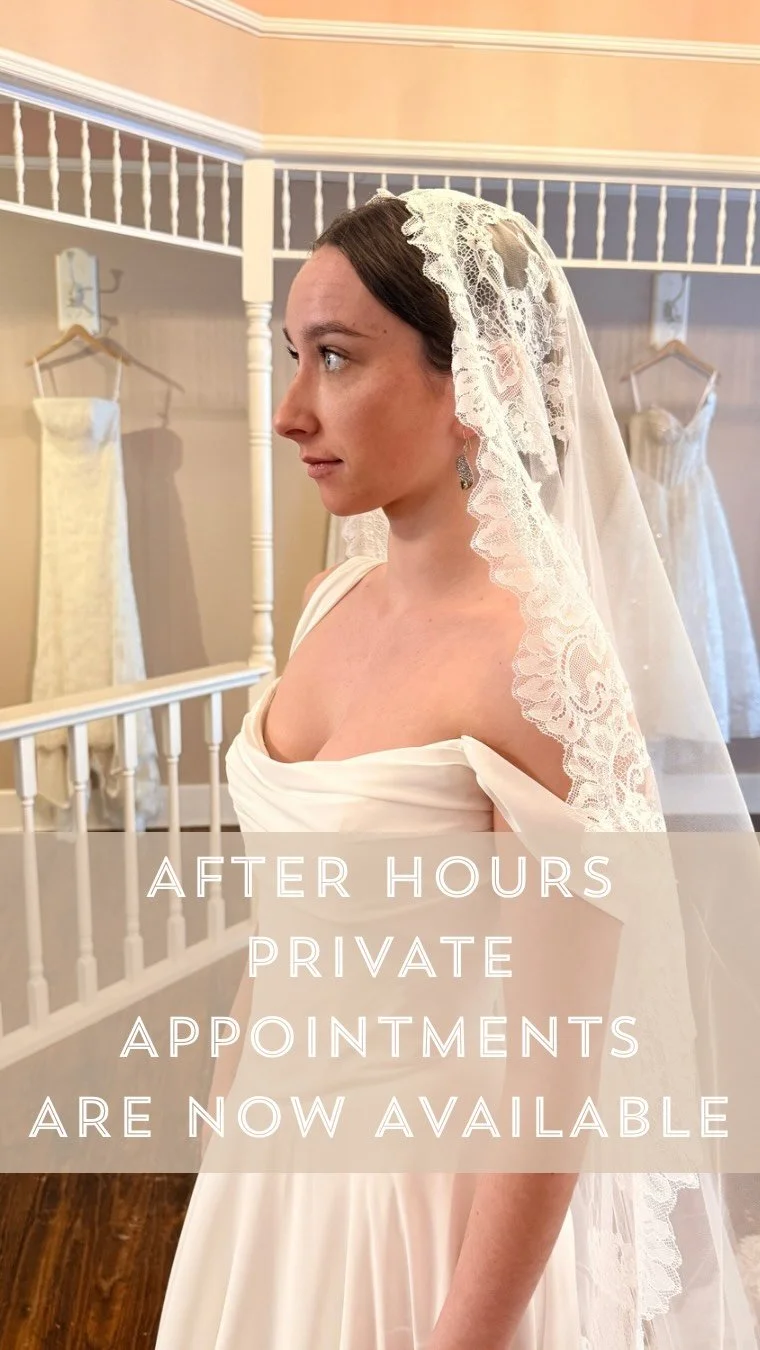 First off, Congratulations! We are so excited for you and we can't wait to celebrate at your bridal appointment. Begin your bridal shopping journey by scheduling a personalized appointment with us. Our one-on-one sessions with supportive consultants ensure a memorable experience! Each appointment gives you time to explore our intentionally curated collection of wedding dresses, tasty treats, celebration, a whole lot of love, and memory-making. Hopefully, you will end your appointment with the dress of your dreams, and become a #CCBride!